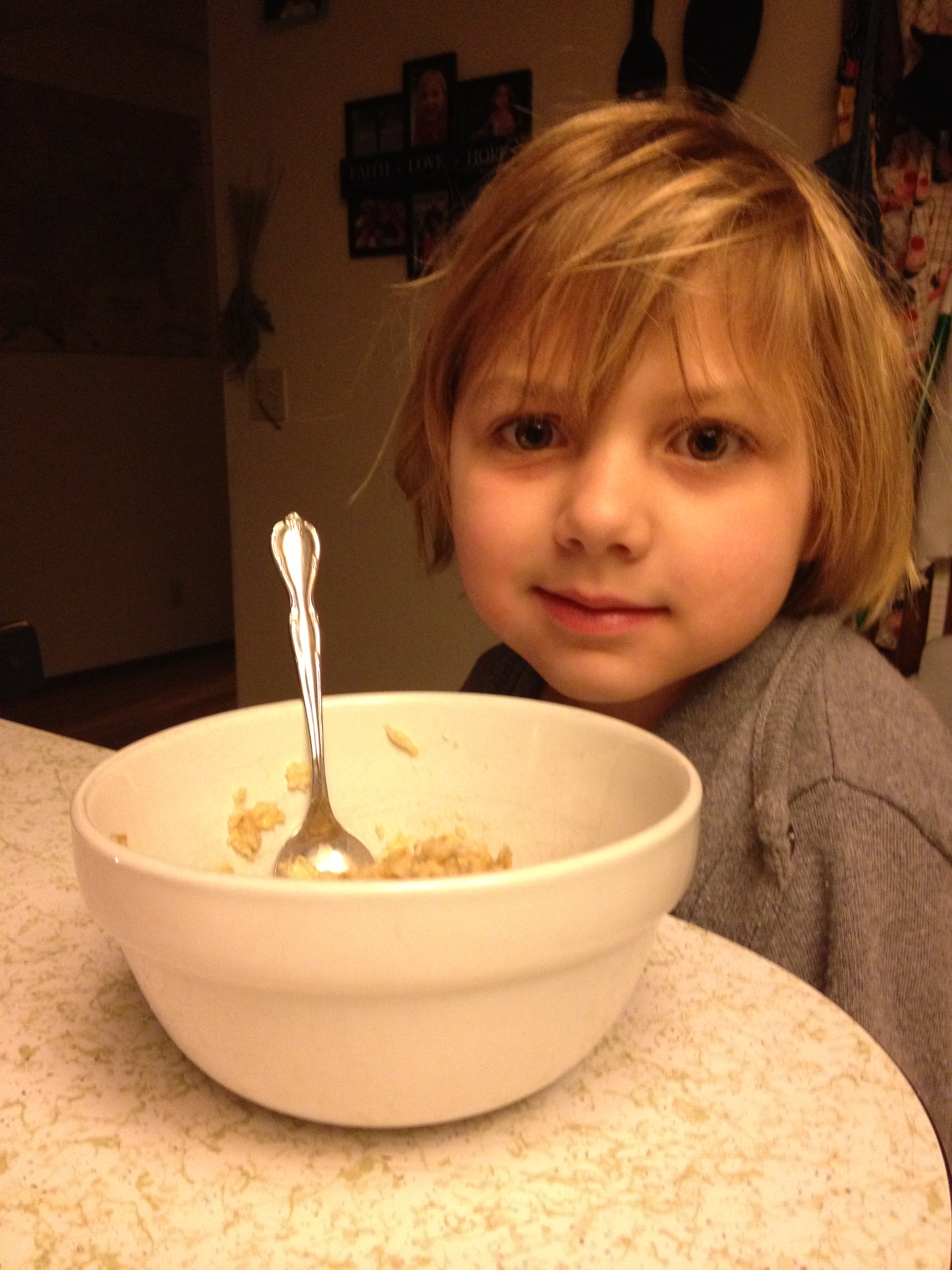 (being cold and too tired to smile, eating her oatmeal next to me)