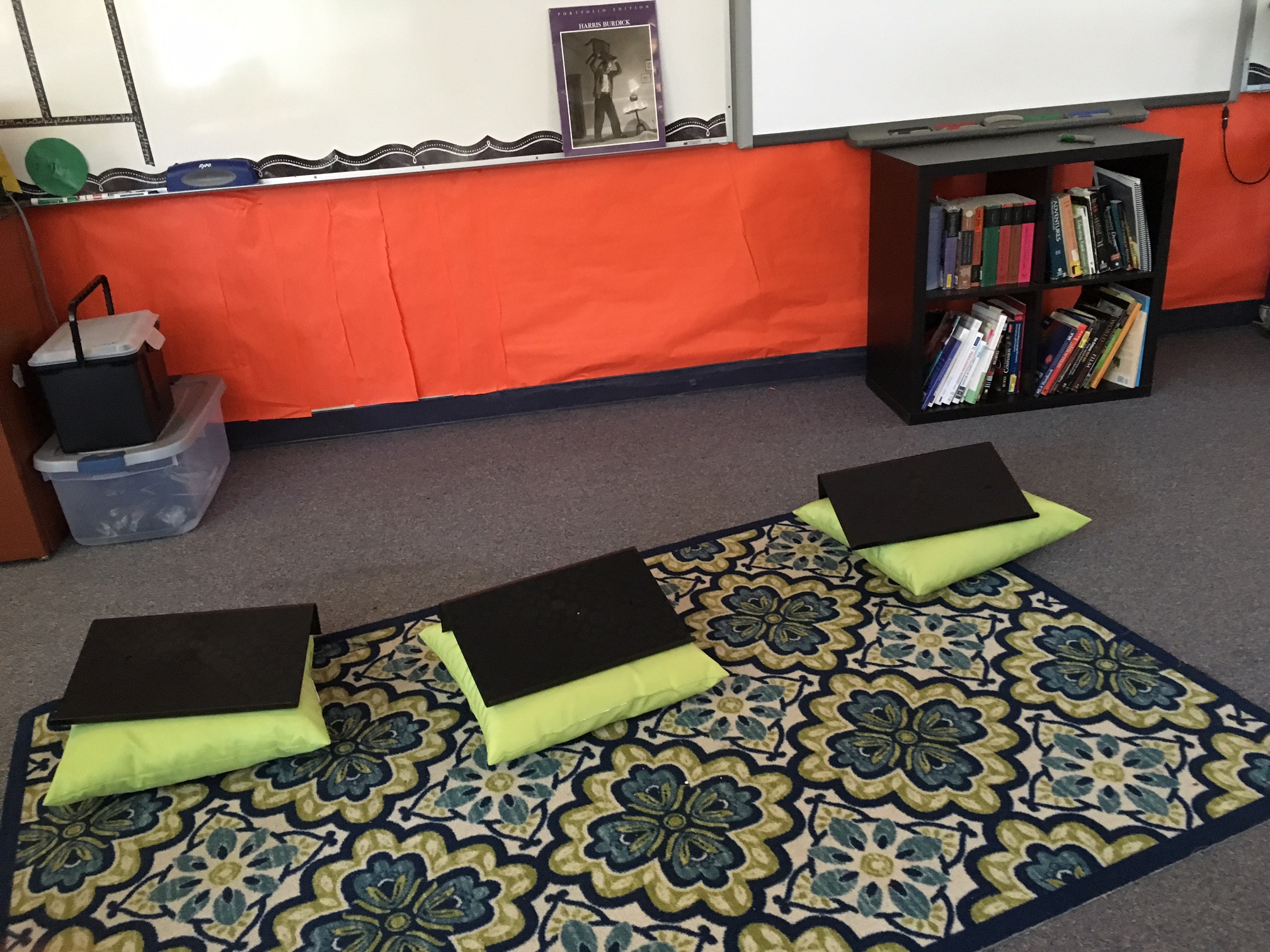 Floor seating toward front of the classroom (pillows and laptop desks):