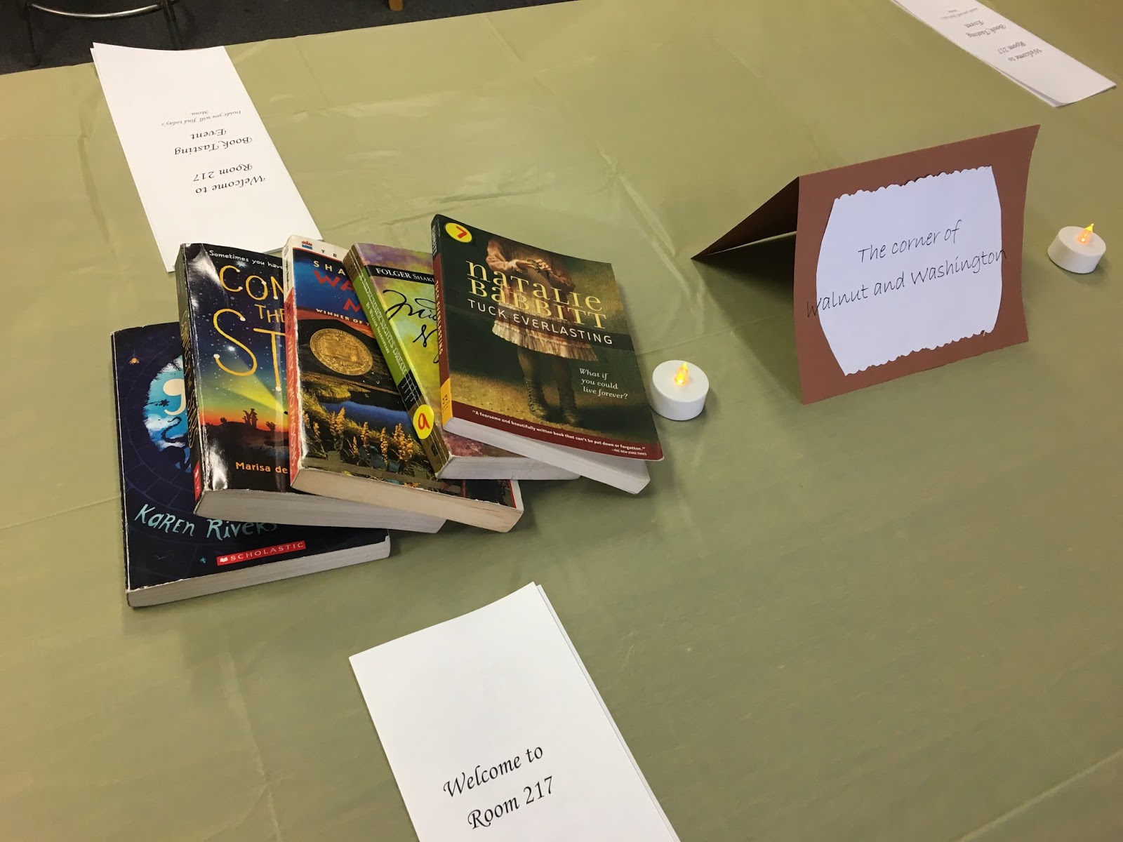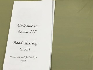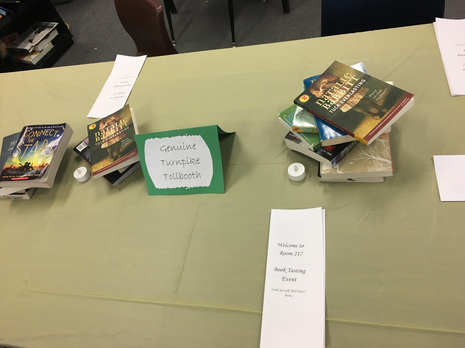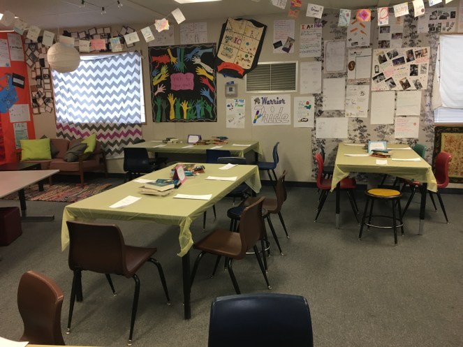 The tables are set and I have their groups picked out so that when the students arrive at the door, I will play waiter/hostess and show them to their tables. On the tables, there are menus which outline the plan for the day and also list the book possibilities along with the author. I’m attaching a picture below.