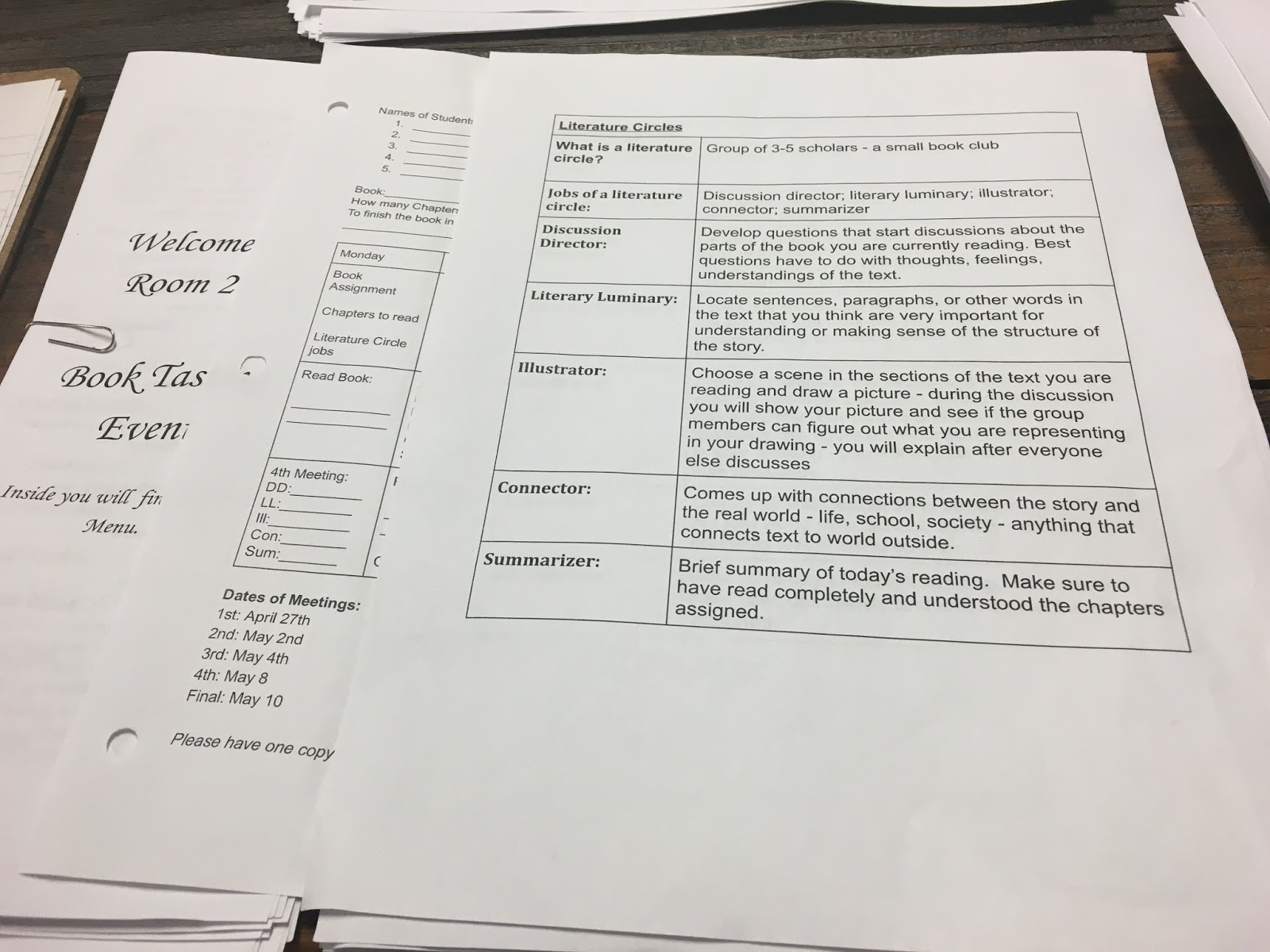 Ie: Discussion director had to come up with 3 questions to ask group and be ready to answer him/her self; Literary Luminary had to find 2 quotes they thought were important to the plot or interesting, or funny, etc…; Connector had to come up with ways the particular sections of the novel being discussed connected with the outside world and/or other literature or film… – You get the idea.